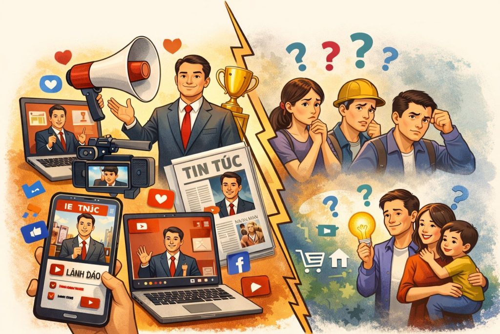 Nhiều kênh truyền thông của các tổ chức hiện nay (Fanpage, YouTube, …), đặc biệt là các tổ chức công, gần như nội dung được phủ sóng bởi người lãnh đạo. Ví dụ có một đại học, có 10 bản tin trên Fanpage thì hết 8 bản là đưa tin về việc giám đốc đại học đó hôm nay làm gì.